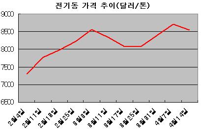 거침없이 오르던 전기동 가격이 4주만에 조정을 받았다. 부동산 경기 침체를 겪고 있는 미국의 수요가 큰 폭으로 줄었기 때문이다.
