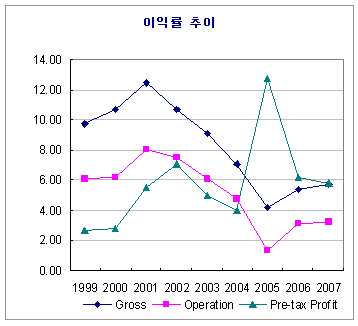 왕성한 투자활동으로 인해 잉여현금흐름도 2003년 -625억원, 2007년 -610억원으로 마이너스 전환됐다.
