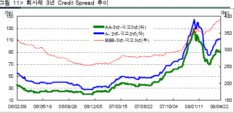 최근 한국은행의 금리 인하 가능성이 확산되자 대부분의 채권이 강세를 보였지만, BBB급 회사채는 정반대로 갔다. 오히려 스프레드가 더욱 확대된 것.
