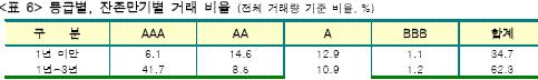 거래도 AAA급이 거의 절반이고 AA급과 A급이 20%씩, BBB급은 2~3% 수준에 그쳤다. 단기물이건 장기물이건 거의 거래가 안되고 있는 셈이다.