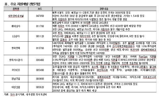 정 애널리스트는 "자원개발은 시간과 자금력, 정보력이 필요한 사업이기 때문에 중장기적 관점에서 준비돼야 한다"며 "주식투자 관점에서는 대기업을 중심으로 진행되는 자원개발에 주목할 필요가 있다"고 밝혔다.