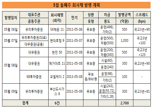 현대로템 7일 1000억원 발행 한국증권업협회가 5.6~5.9일까지 발행될 회사채를 집계한 결과 총 6건, 2700억원으로 나타났다. 자금용도는 운영자금이 1591억7200만원, 차환자금이 600억원, 시설자금이 303억원, 기타가 5억2800만원이다. ⓒ한국증권업협회 ※ 5/9 발행 예정이던 디보스 제4회차 무보증 전환사채는 발행 연기 되었음. (유진투자증권 주관) ※ 상기 사항은 회사사정에 따라 발행이 연기되거나 취소될 수 있음. ※ 직접공모 발행 사항은 계획에서 제외함. 독자들의 PICK! 홍서범 전 며느리 "아들 외도, 대중에 사과? 저에게 하시라" 분노 월 700만원 벌어도..."생활비 30만원, 한국인 남편 짠돌이" 화사, 속옷이 다 보여...과감한 드레스 연출에 '깜짝' 이하이 "도끼, 하나뿐인 내 남자" 열애 인정…"두 사람 지금 미국에"