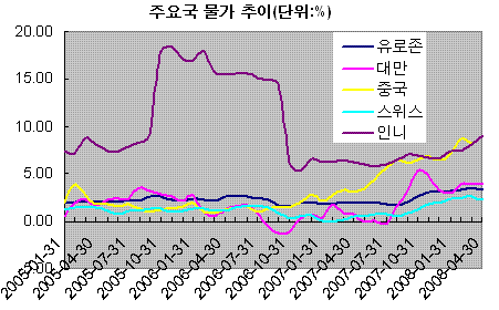 작년말 이후 주요 국가들의 물가지수(CPI)는 동반 상승세다. 고성장을 하고 있는 중국과 인도네시아 뿐 아니라 경기 침체를 겪고 있는 유로존도 예외가 아니다.