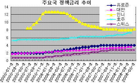 유럽과 같이 경기 하강에 있는 국가들은 금리 인하를 늦추는 식으로 물가 압력 확대를 제어하고 있다. 동시에 미국 달러화 약세를 받아들여 자국 통화 강세를 유도,인플레 압력을 완화시키고 있다. 중국과 남미 등 경기 상승세가 지속되는 나라는 통화 강세와 더불어 금리 인상까지 단행하고 있다.