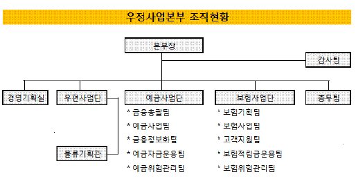 우체국금융의 운용은 분야별로 '예금사업단'과 '보험사업단'에 분리돼 있다. 이 가운데 예금쪽은 옛 주무부처인 정보통신부 출신이, 보험쪽은 새 주무부처인 지식경제부(옛 산업자원부) 출신이 사이좋게 맡고 있다.