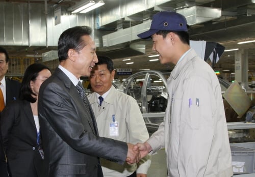 이명박 대통령이 베이징현대차에 근무하는 중국 현지 근로자를 격려하고 있다.