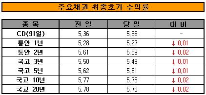 증권업협회가 장마감 기준으로 고시한 국고채 3년물과 5년물은 전일보다 0.1%포인트 내린 5.49%, 5.61%로 거래를 마쳤다.