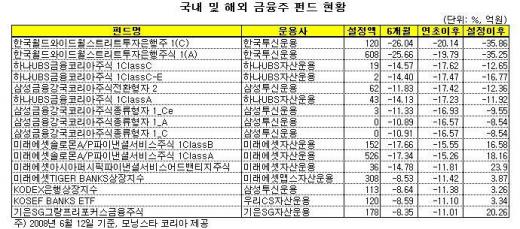 해외 금융주펀드 중에서는 한국운용의 '월드와이드월스트리트투자은행주 1(C)'가 -20.14%의 수익률을 기록중이다. 미래에셋맵스의 '솔로몬A/P파이낸셜서비스주식 1ClassA'도 -15.26%의 수익률을 보이고 있다.