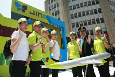 15일 대한항공에 따르면 진 에어는 이날 서울 명동 외환은행 본점 앞 광장에서 출범식을 열어 나비 모양의 기업 이미지(CI), 파격적인 컬러의 항공기, 청바지를 입은 객실승무원을 공개했다.