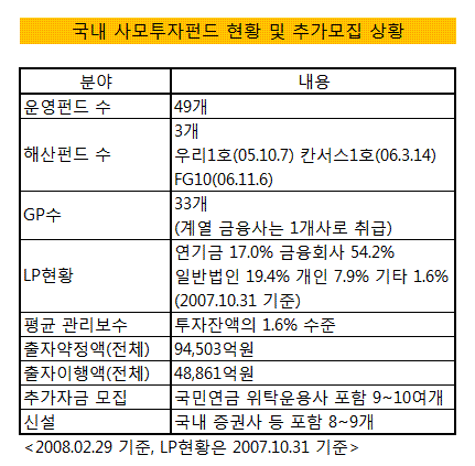 한때 업계에는 무려 20여개에 달하는 펀드들이 동시다발적으로 자금을 구하러 다니는 일도 발생했다. 연기금의 한 관계자는 "지난 5월에는 같은 날 5곳의 PEF가 한꺼번에 자금유치를 위해 만나고 싶다는 연락을 해왔다"며 "투자할 수 있는 자금은 많지 않은데 어느 펀드를 고를지 고민"이라고 토로했다.