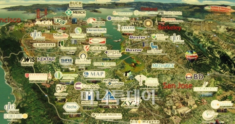 이런 분위기에 힘입어 제넨텍 등을 필두로 한 바이오벤처들 역시 이곳에 모여있다. 이들은 기초연구에서 신약 후보물질 선정, 임상, 생산, 상업화까지의 각 분야를 제각각 담당하면서 신약개발을 위해 노력하고 있다.