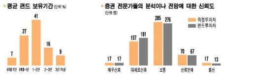 개인 펀드투자자들은 전문가들의 분석 및 전망에 대해 '보통' 50%(277명), '대체로 신뢰' 33%(182명), '매우신뢰' 3%(16명) 등으로 답해 믿음을 보였다.
