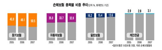 손해보험시장에서 장기보험이 차지하는 비중이 50%를 넘어섰다. 또 자동차보험도 최초로 10조원을 돌파했다.