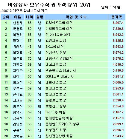 또 상장을 앞둔 SK C&C의 지분 44.5% 보유한 최태원SK그룹 회장은 5943억원으로 5위, 이재용 삼성전자 전무는 삼성에버랜드 등의 비상장사 보유주식 평가액이 5674억원으로 6위, 이준용대림산업(49,200원 ▲2,050 +4.35%)명예회장은 5375억원으로 7위, 강영중대교(1,735원 ▼49 -2.75%)그룹 회장이 4015억원으로 8위, 김정주 넥슨홀딩스 대표가 3410억원으로 9위, 허정수 GS네오텍 대표가 3281억원으로 10위를 기록했다.