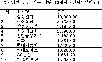 상장 100대 기업 등기임원 한 명에게 지급한 평균 급여액은 8억 1470만 원이었고, 1인당 연봉이 가장 높은 기업은 삼성전자로 133억 원을 기록했다.