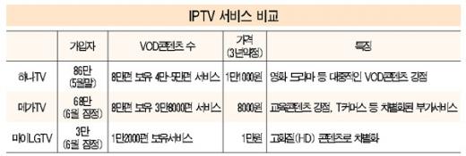 실시간 방송 서비스가 제공되지 않고 있는 현재 IPTV의 주 메뉴는 VOD서비스다. 메가TV와 하나TV는 8만여편의 VOD 콘텐츠를 확보했다. 현재 소비자가 선택할 수 있는 콘텐츠는 3만~5만여편. 후발 사업자인 마이LGTV는 1만2000편의 콘텐츠를 보유, 제공하고 있다.