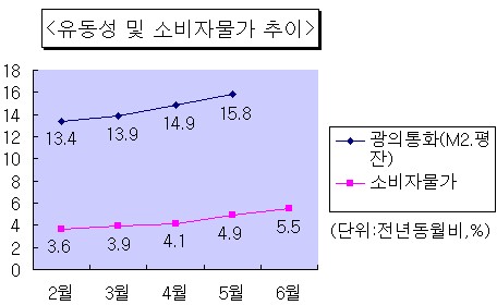 물가와 함께 시중 유동성의 지속적인 증가도 금리인상의 명분이다. 지난달 광의통화(M2.평잔) 증가율은 15.8%(전년동월대비)로 99년 6월(16.1%) 이후 최고 수준을 기록했다. M2 증가율은 1월 12.5%에서 2월 13.4%, 3월 13.9%, 4월 14.9% 등으로 가파른 상승세를 이어가고 있다.