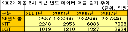 이통3사 모두 데이터 매출은 2000년 이후 매년 꾸준히 증가하고 있다. 특히, SK텔레콤은 2003년 무선인터넷 매출이 처음으로 1조원을 넘은 후 지난해 2조7340억원까지 늘어나 금액 측면에서 무시할 수 없는 수준에 이르렀다.