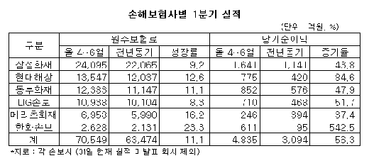 삼성 현대 동부 LIG 메리츠 한화 등 6개 손보사는 1분기에 4835억원의 당기순이익을 기록했다. 지난해 같은기간에 비해 56.3% 늘어난 것이다. <표참조>