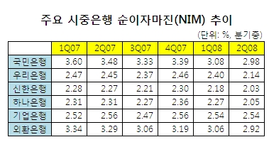 우리은행의 NIM도 2.14%로 지난해 말보다 0.32%포인트 하락했다. 특히 2분기 들어 NIM이 0.26%포인트 급락하며 이 기간 중 하락폭이 가장 컸다. 신한은행의 2분기 말 NIM은 2.03%로 올해 상반기 중 0.27%포인트 하락했고, 2.05%를 기록한 하나은행도 올해 들어서만 0.31%포인트 떨어졌다. 상대적으로 높은 NIM 수준을 유지해 왔던 외환은행도 지난 상반기 중 0.27%포인트 하락하며 2%대로 내려앉았다.