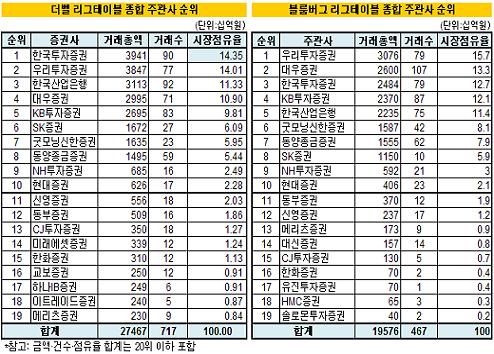 우선 상반기 종합주관 순위 1~8위가 기존의 리그테이블과 달랐다. 7월초 블룸버그 발표로 1위였던 우리투자증권은 더벨 리그테이블에서 2위로 밀렸고 2위였던 대우증권도 4위로 떨어졌다. 대신 한국투자증권이 1위를 차지했다. 블룸버그 기준 5위인 산업은행은 3위로 올라섰다.