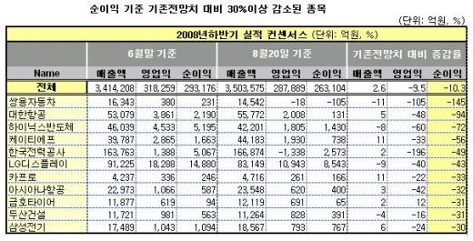 기존 전망치 대비 영업이익이 30%이상 감소할 것으로 예상되는 종목은한국전력공사(61,000원 ▲200 +0.33%)(-195%),쌍용차(4,015원 ▼5 -0.12%)(-105%),하이닉스(860,000원 ▼16,000 -1.83%)(-60%),대한항공(24,950원 0%)(-48%),아시아나항공(7,800원 0%)(-42%),LG디스플레이(11,910원 ▲240 +2.06%)(-40%),KTF(-33%),삼성전자(167,800원 ▲2,000 +1.21%)(-32%),STX조선(-31%) 등이다.