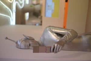 정확히 반을 나눠 왼쪽은 정상인이지만, 다른 반쪽은 외계인으로 분장한 젊은 여성이다. 처음에는 다소 당황해하던 행인들이 둘러모여 마냥 신기하듯 연신 폰카를 눌러댔다.