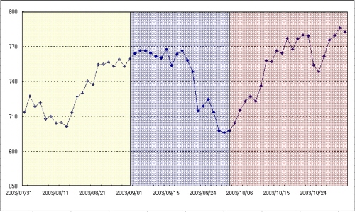 2003년에도 9월 유동성 위기설이 투자심리를 위축시켰다. LG카드 등 카드업계와 하나로통신의 유동성 위기 등이 투자심리를 위축시켰다. 같은 해 8월말 759.47포인트였던 코스피지수는 9월말 697.52포인트로 밀렸으나 대란설이 근거없다는 공감대가 형성되며 10월말 782.36포인트까지 올랐다.