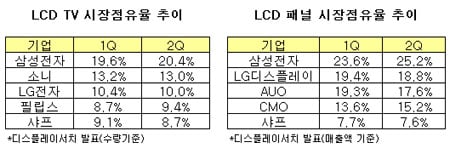 TV 시장도 같은 양상이다. 저가 전략을 내세운 소니의 도전에 맞서면서 수익성은 하락했지만 시장점유율은 상승했다. 실제로 2분기 삼성전자의 전 세계 LCD TV 시장점유율(판매대수 기준)은 20.4%로 업계 처음으로 20%를 넘어섰고 2위 소니와의 격차도 6.4%포인트에서 2분기 7.4%포인트로 벌어졌다.