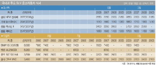 그러나 수입 SUV는 별다른 변화가 없는 상태다. BMW의 X5 3.0의 경우 출고가격 8890만원인 2008년형 중고차의 시세가 7800만원, 2007년형은 7400만원으로 가격변동이 없다. 다만 휘발유가 원료인 혼다의 CR-V 4WD는 6월과 7월 사이에 일부 연식에서 100만원가량 하락했다.