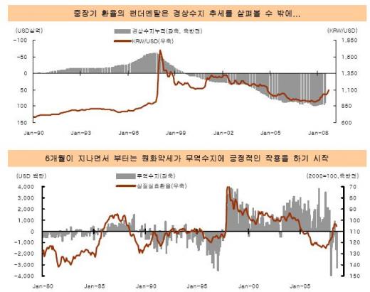 장 연구원은 특히 무역수지와 서비스수지가 실질실효환율에 반응하는 시차를 고려하면 4분기 이후 경상수지는 점차 개선될 것으로 내다봤다. 그리고 이같은 경상수지 개선은 환율에 즉각적인 영향을 미칠 것이라고 강조했다.