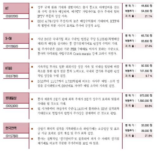 장 연구원은 "경기에 상관없이 이익의 안정성을 확보했다는 점과 특히 일부 종목의 경우 정부 감세안의 수혜가 예상된다"며 "대부분 자산가치 역시 우량하다는 점이 강점"이라고 밝혔다.