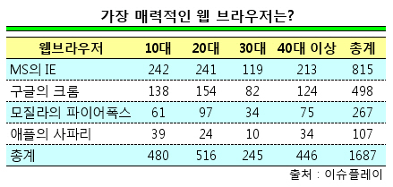 네티즌 1687명을 대상으로 벌인 설문조사에서 전체의 48.3%가 IE를 선호한다고 꼽았고 최근에 출시된 구글의 '크롬'은 29.5%의 선호도를 보였다. 모질라재단의 '파이어폭스'에 대한 선호도는 15.8%, 애플의 '사파리'는 6.3%로 뒤를 이었다.