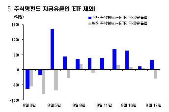 ETF제외 주식형펀드로는 9일 연속 자금 유입이었고 9월 누계 기준으로 3840억원의 돈이 들어왔다. 9월 들어 하루 평균 295억원의 돈이 들어온 셈이다.
