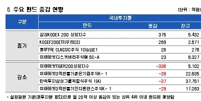 반면 미래에셋TIGER200상장지수 에서 336억원, 미래에셋3억만들기좋은기업주식K- 1 에서 39억원의 자금이 빠져나갔다. 한국투자삼성그룹적립식주식 1(A)에서도 37억원의 돈이 유출됐다.