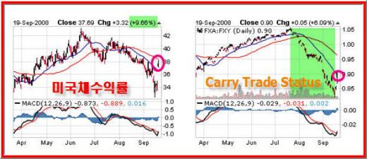 미국 금융시장이 이토록 급박하게 돌아가자 지난 주까지 진행되던 유동흐름의 물꼬도 돌변한다. 불안하던 상품가격이 급반등한 반면, 폭등하던 금값이 폭락하고 안전자산이라면서 몰리던 10년만기 미국채수익률은 하루에만 무려 10%가까운 폭등을 하는 또 다른 아수라장이다. 신용스프레드가 진정된다면 물론, 캐리트레이드(유동성장)의 여건도 좋아진다.