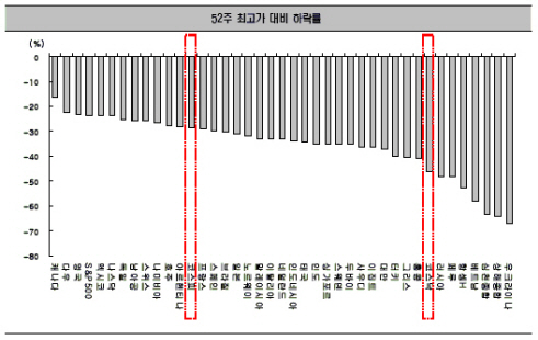 이는 캐나다, 미국, 영국, 독일, 호주, 스위스 등 선진국 지수의 낙폭과 유사한 수치며 52주 최고치 대비 낙폭이 30∼40%에 달하는 여타 국가나 심지어 1/3토막이 난 일부 이머징국가의 증시와 비교가 되지 않는 선방이다.
