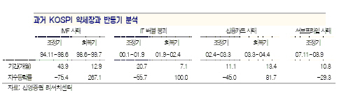 IMF사태, IT버블붕괴, 신용카드사태 등 지난 3차례의 약세장을 고찰해볼 때 주가 조정기간과 조정강도가 약해지고 있는 것은 악재 민감도가 과거에 비해 낮아지고 있다는 진단이 가능하다.