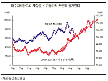 최근 환매 사태에 시달리고 있는 투신권의 일평균 2000억원 이상의 주식을 매도하고 있지만 프로그램 차익거래잔액이 최저 수준으로 떨어졌고 4분기에 비차익거래가 크게 늘어나는 경향을 감안한다면 수급불안이 되풀이되지 않을 가능성이 크다.