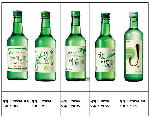 참이슬은 지난 1998년 소주는 25도라는 상식을 깨며 23도 제품으로 첫 선을 보였으며 리뉴얼 과정을 통해 현재(참이슬 오리지널)는 20.1도로 도수가 낮아졌다. 2006년 출시된 '참이슬 후레쉬'는 19.5도.