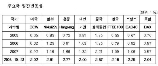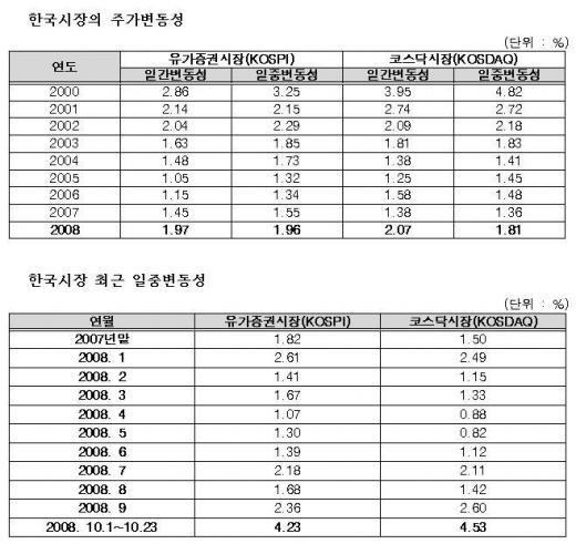 한편 10월23일까지의 일간변동성은 코스피시장 및 코스닥시장이 각각 1.97%, 2.07%로 2007년 1.45%, 1.38%보다 증가했다.