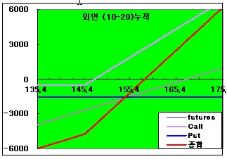 상기의 선물, 콜옵션, 풋옵션을 결합한 합성포지션을 보게되면 손익분기점(손실=이익)은 158.80p이상에서 수익구조를 그 이하에서는 손실 구간은 갖는 상방형 합성포지션으로 나타나고 있음을 알 수 있는데 이를 토대로 본다면 외국인은 파생시장에서는 손실 구간에 위치해 있음을 파악 할 수 있다.