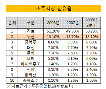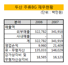 두산의 주류사업부문은 소주 '처음처럼', '산','그린', 약주 '국향','군주', 와인 '마주앙'등의 브랜드를 보유하고 있다. 소주시장에서는 지난 2006년 출시한 처음처럼의 인기에 힘입어 13%대 시장점유율을 확보, 진로에 이어 업계 2위의 지위를 구축하고 있다. 작년 매출은 3419억원, 영업이익은 214억원을 기록했다.