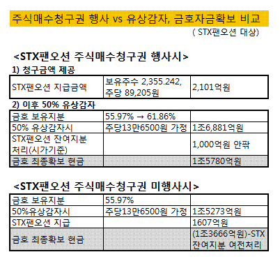 STX팬오션이 주식매수청구권을 행사해 주면 금호그룹은 내년 2월까지 2101억원이 필요하다. 주식매수청구기간 종료일(2009년1월2일)로부터 1개월 이내에 금액을 지불해야 하기 때문.