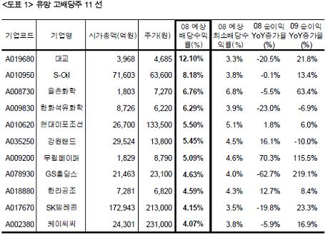 교보증권(14,000원 ▲1,270 +9.98%)은 10일 최근 경기침체와 기업실적 악화로 배당 감소 우려가 높지만 주식시장이 약세장이고 변동성이 큰 것을 감안하면 여전히 배당주 투자전략은 유효하다며 유망 고배당주 11개를 선정했다.