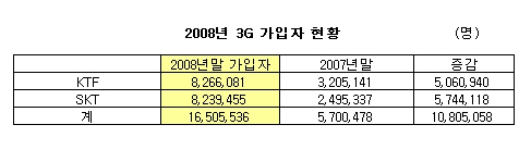 SK텔레콤은 2007년 12월 기준 3G 가입자 수가 249만5337명에 불과했으나, 지난 한해 574만4118명의 3G 가입자를 확보하는 기염을 토했다. 이에 비해 KTF는 2007년 말 누적 가입자 320만5141명에서 506만940명이 늘어났다.