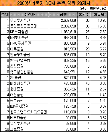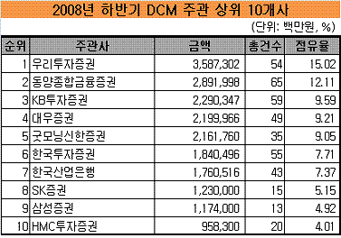 2008년 더벨 DCM 리그테이블에 따르면 우리투자증권은 지난해 7조4327억원(131건)의 공모채권(일반 회사채·여전채·ABS 포함)을 주관하며 명실상부한 DCM 명가로 자리매김했다. 차순위에 올라 있는 한국투자증권(5조7819억원), 대우증권(5조1842억원)과 2조원 안팎의 차이가 난다.