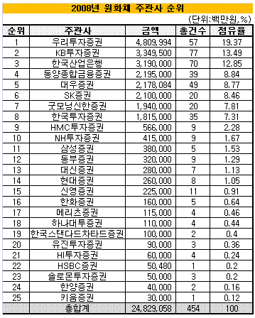5일 2008년 더벨 DCM 리그테이블에 따르면 우리투자증권은 지난해 총 98건의 원화채(여전채와 ABS 제외) 4조1209억원 어치를 인수해 2위인 한국산업은행(84건, 2조8340억원)을 멀찌감치 따돌렸다. 전체 인수사중 점유율 10% 이상을 기록한 곳은 우리투자증권과 산업은행 뿐이다.