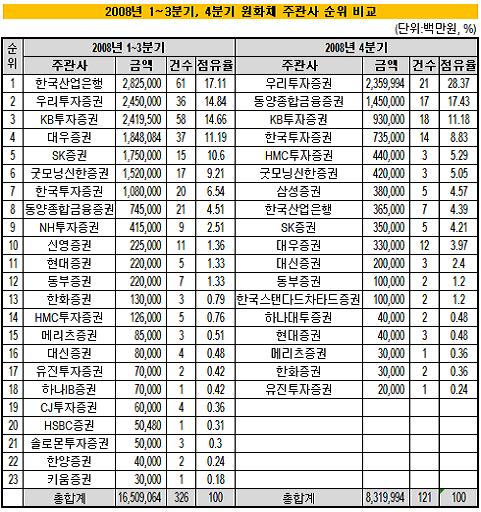 3분기까지 원화채권 주관 1위를 달리던 산업은행은 4분기에 브레이크가 걸리는 바람에 3위로 밀렸다. 동양종합금융증권은 4분기 하나금융지주 등의 대규모 채권발행을 주관하며 약진, 연간 주관부문 5위안에 이름을 올렸다.
