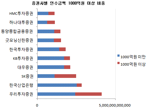 우리투자증권은 올해 1000억원 이상 인수를 10건이나 했다. 다른 대형사들이 기록한 2~3건을 크게 앞설 뿐만 아니라 건별 단위금액도 압도적으로 컸다. 10건중 8건이 대표주관사로 참여한 딜이라는 점도 특징이다.